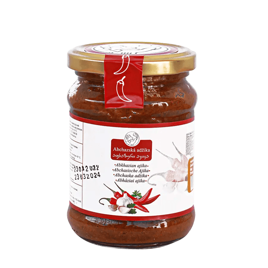 Abchasische Adjika ist eine kräftige und aromatische georgische Gewürzpaste, die ihren Ursprung in den kulinarischen Traditionen von Abchasien, einer Region im Westen Georgiens, hat. Dieses einzigartige Rezept kombiniert scharfe Chilischoten, Knoblauch, Salz und lokale Kräuter wie Koriander, blauen Bockshornklee und Majoran zu einer konzentrierten, würzigen Mischung mit einem scharfen, aber ausgewogenen Charakter.