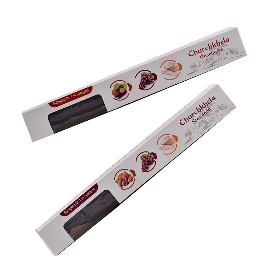 Dieses handwerklich hergestellte georgische „Snickers“ ist eine natürliche, traditionelle Alternative zu modernen Energieriegeln – hergestellt ohne Zuckerzusatz, Konservierungsstoffe oder Süßungsmittel. Es handelt sich um eine Form von Churchkhela, einem beliebten georgischen Snack, der aus ganzen Walnüssen, getrockneten Früchten (darunter Pflaumen und Aprikosen) und eingedicktem Traubensaft aus Rkatsiteli-Traubenmost und Weizenmehl hergestellt wird.