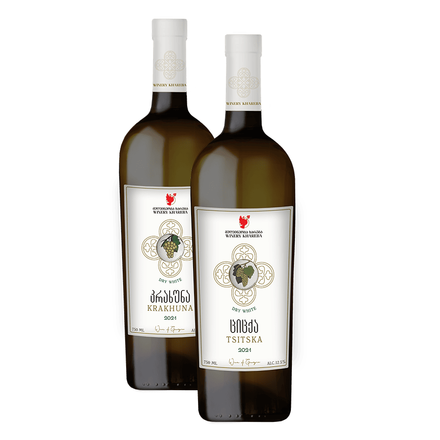 Dieses Verkostungsset enthält drei Premiumweine aus dem Weingut Khareba. Die Rebsorten stammen aus verschiedenen Regionen Georgiens. Der trockene Weißwein Tsitska wird aus der Rebsorte Krakhuna gekeltert, die in der westlichen Region Georgiens – Imereti – beheimatet ist. Er hat einen vollen Körper mit harmonischen Zitrusnoten. Seine Farbe ist hell strohfarben. Der trockene Weißwein Krakhuna wird aus der Rebsorte Krakhuna hergestellt. Diese Sorte stammt aus der westlichen Region Imereti und zeichnet sich durch ihre späte Reife aus. Der Wein hat eine strohgelbe Farbe mit goldenen Reflexen und ein charakteristisches Aroma von reifen Früchten und Honig.
